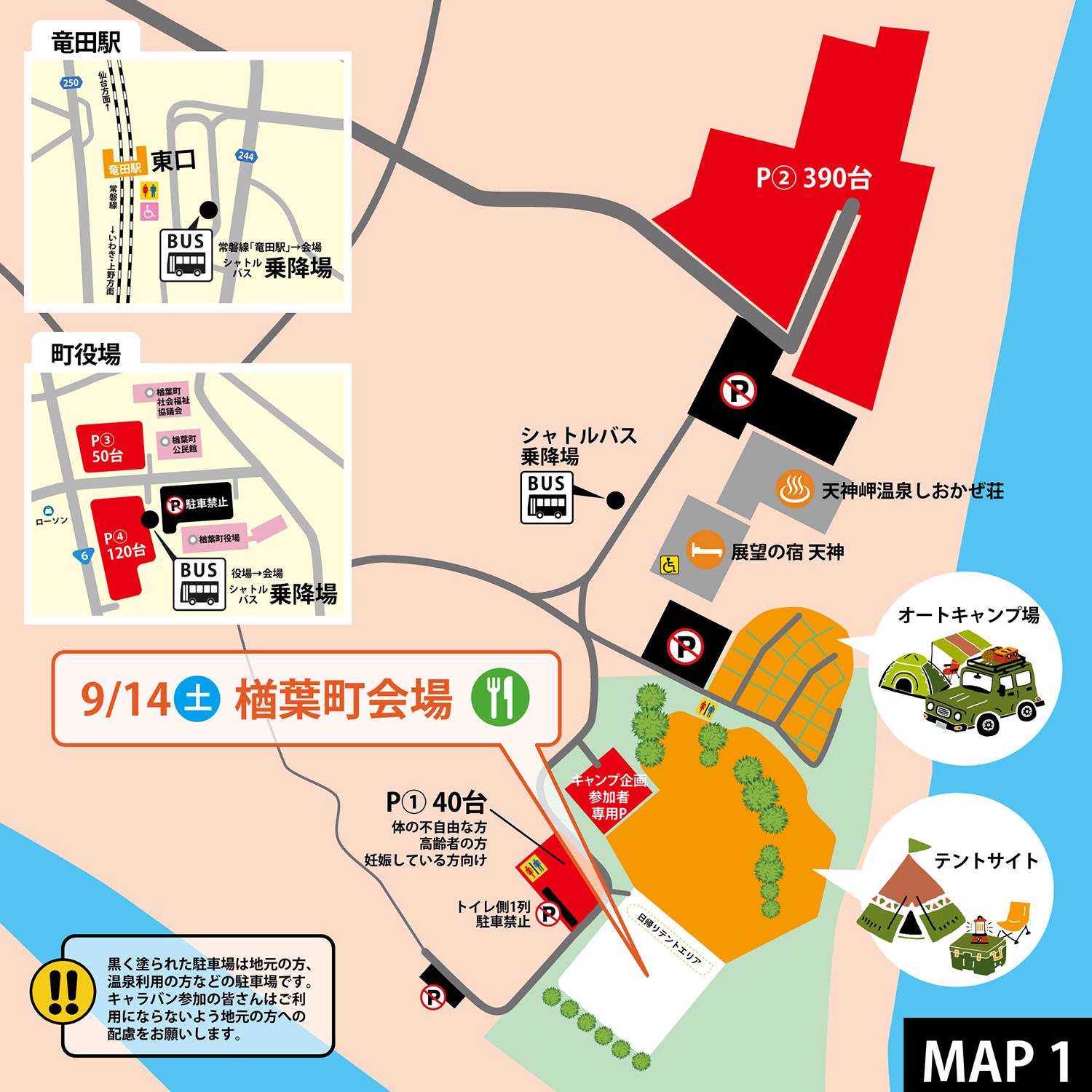 ・宿泊するキャンプサイトとは別に日帰り参加者むけのテントエリア(簡易テントに限ります)を用意します。MAP1を事前に参照ください。