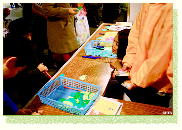 来場された方々に、「防災・減災」に関する取り組みを書いて頂きました。地震や津波、大雨による被害など、災害はいつ襲ってくるか分かりません。そこで、皆さんに、防災に対する意識を高めるきっかけにしてもらおうと、「今実際に行っていること」や「これからやろうと思っている防災対策」を葉っぱの形をしたメッセージカードに記入して頂きました。 このカードは、フリースクール札幌自由が丘学園の皆さんが一枚一枚丁寧に作ってくれました。 皆さんからの「防災の誓いの木」は、HTB正面入り口のエントランスと秀岳荘白石店に提示します。
