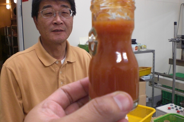 ワイン工場を案内してくれた北海道アグリマートの佐竹社長と自慢のトマトジュース!