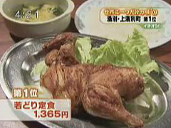 ▽50年間変わらぬ味とボリュームが大人気。山椒などのスパイスがピリッと効いた若どりは、、皮はパリパリ、肉は柔らかくジューシーです。