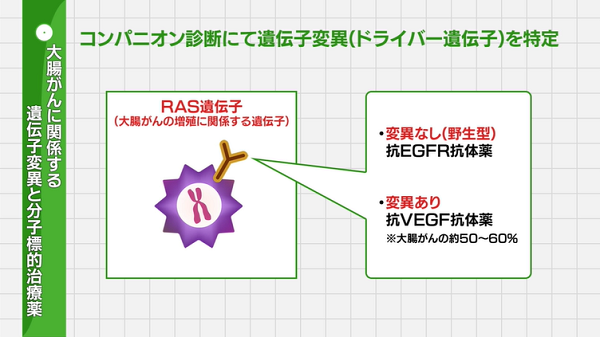 「大腸がん」に対する分子標的治療薬は、「RAS遺伝子」という遺伝子の変異の有無を、コンパニオン診断によって特定し、変異が無ければ「抗EGFR抗体薬」、変異が有れば「抗VEGF抗体薬」というように二種の分子標的治療薬で対応します。