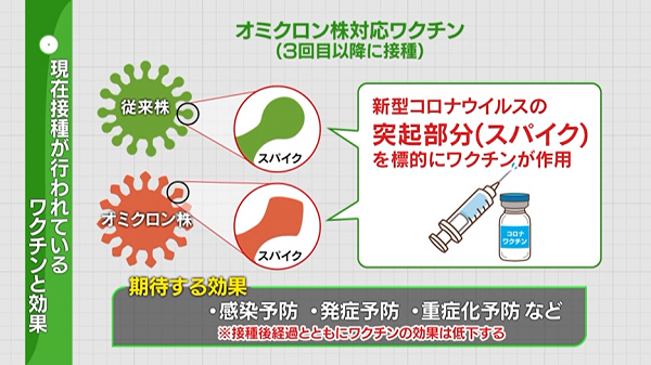 新型コロナに対するワクチンは、従来株からオミクロン株に変異する過程で、ワクチンの標的となる突起部分(スパイク)も大きく変異しましたので、現在、接種が行われているワクチンは、従来株とオミクロン株のいずれにも作用し、感染や発症、重症化の予防が期待できるオミクロン株対応ワクチンとなっています。但し、オミクロン株対応ワクチンであっても、接種後、時間の経過とともに、その効果は低下していきます。