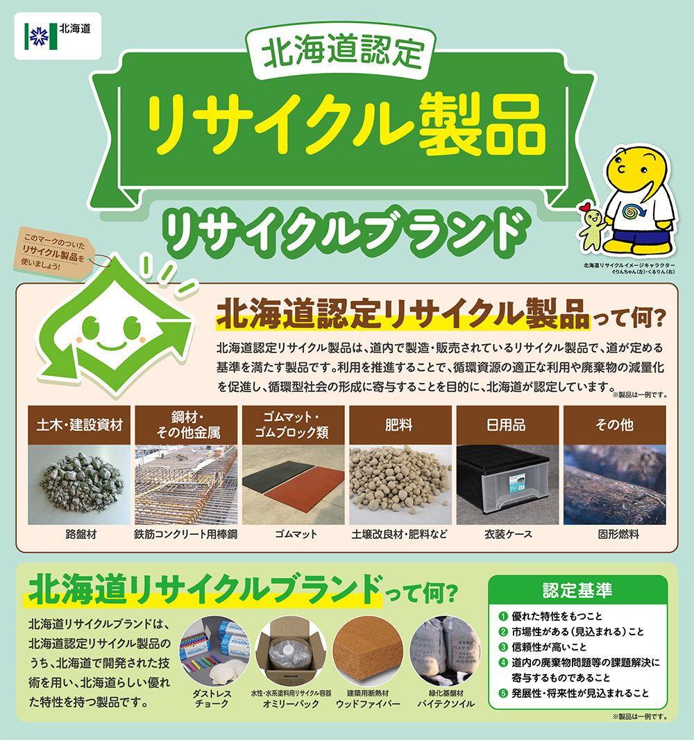 北海道では道内で製造加工された一定の基準を満たすリサイクル製品を認定し、利用を促進しています。