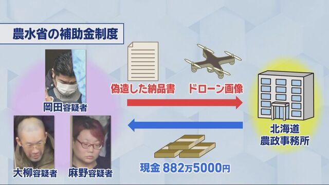 元「大雪りばぁねっと。」の3人が逮捕された、今回の補助金詐欺事件。警察によりますと、岡田容疑者ら3人は、スマート農業を推進するための農水省の補助金制度を悪用。農業用のドローンを購入したように装い、偽造した納品書やドローンの画像を北海道農政事務所に送信して補助金を申請。882万5000円を振り込ませた疑いが持たれています。