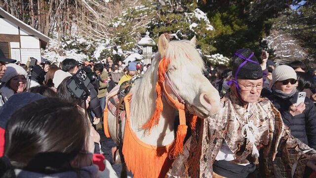 函館八幡宮では華やかな飾りつけをした馬が石段を登る騎馬参拝が行われました。