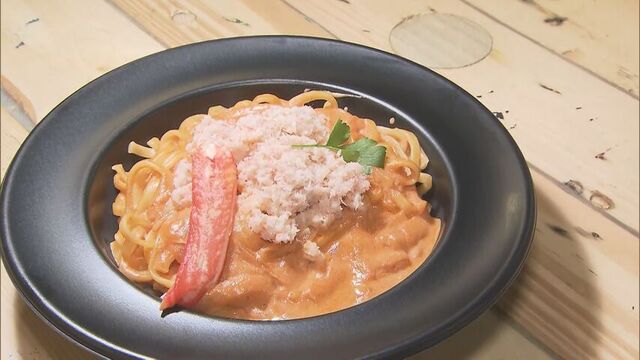 こちらは郡司裕也選手がHTBの番組「FFFFF」とコラボし、おしゃれ路線でプロデュースした「さすカニ俺、カッコイイ!」カニクリームパスタです。
