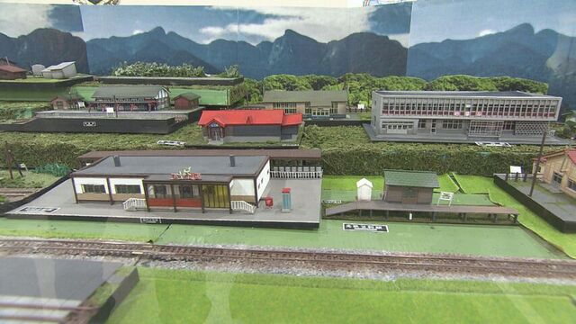 駅前のホテルのロビーに展示された留萌線のジオラマ。美術製作の経験を生かし、留萌線の22駅を実物の150分の1サイズで再現しました。