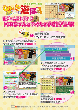 HTBデータ放送の通信コンテンツ(※)「onちゃんと遊ぼ!」に新しいゲーム「onちゃんとつめしょうぎ」が加わりました。