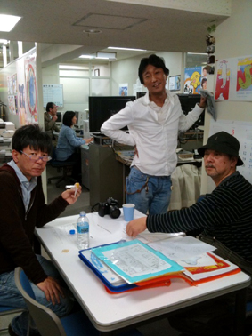 くまくまは悲鳴を上げていましたけれどね、大先生たちはドッカと打ち合わせテーブルにお座りになって、自主的に作業を進める、進める。証拠写真ですよ↓。この前のお写真で、う先生の老眼鏡が鼻眼鏡になっていて「おぢさんみたい」って評判を落とされていたので、「先生、眼鏡外してください!そのほうが若いです!」って、いうポーズ。ちょうど、通りかかったのは、「素晴らしい世界」のディレクターのクボイキョウ君です。クボイキョウ君もツイートしていますからね。フォローしてあげると、うれしいきゃも。確か、@kkuboi ですよ。